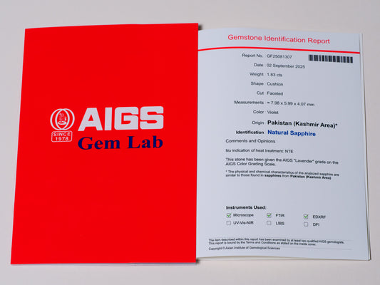 Certified No heat 1.83ct Kashmir Violet Sapphire
