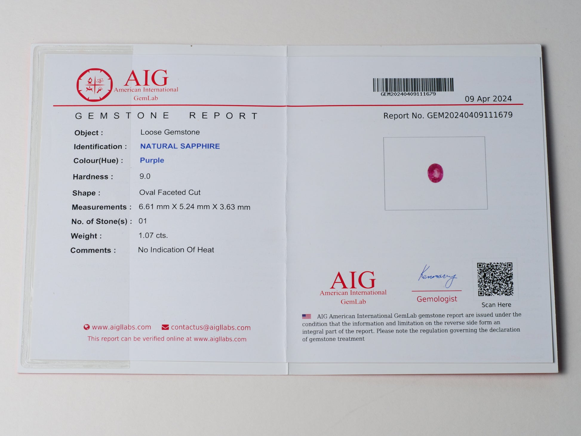 This Certified No Heat 1.07ct Purple Sapphire offers a rare, untreated gemstone known for its vivid and natural purple hue. Expertly graded and verified, this sapphire maintains its integrity without any heat treatment, ensuring exceptional value and authenticity. Perfect for discerning collectors or custom fine jewellery, it combines natural beauty with ethical assurance.
