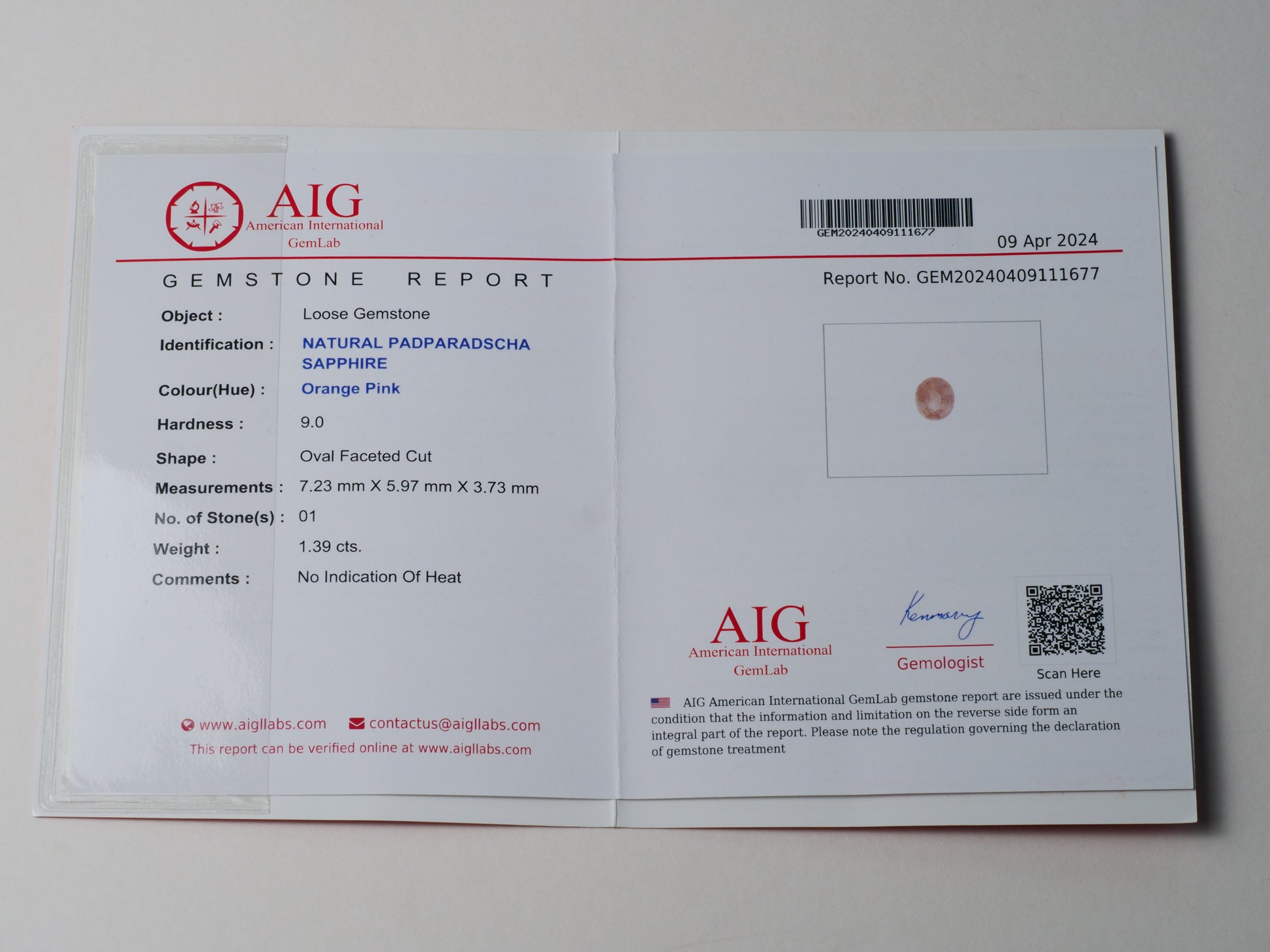 Certified No heat 1.39ct Padparadscha Sapphire