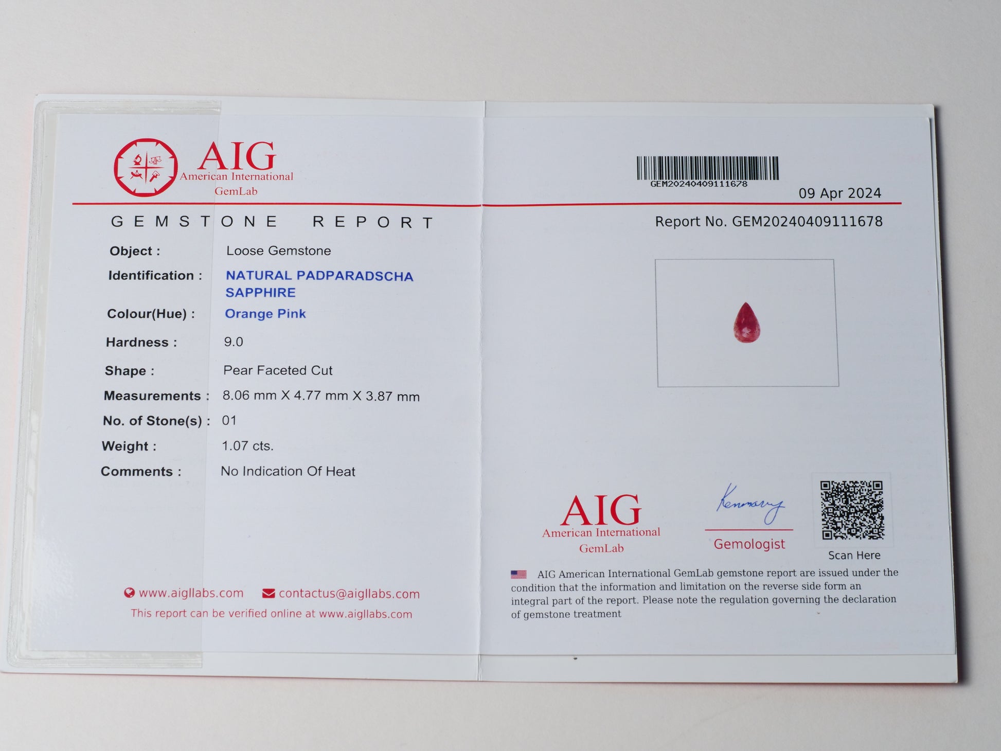 This certified 1.07ct Padparadscha sapphire is a rare and exquisite gemstone distinguished by its natural, no-heat treatment provenance. Valued for its unique blend of pinkish-orange hues, this sapphire offers exceptional purity and brilliance, making it ideal for collectors and connoisseurs seeking authenticity and outstanding colour quality in fine jewellery.