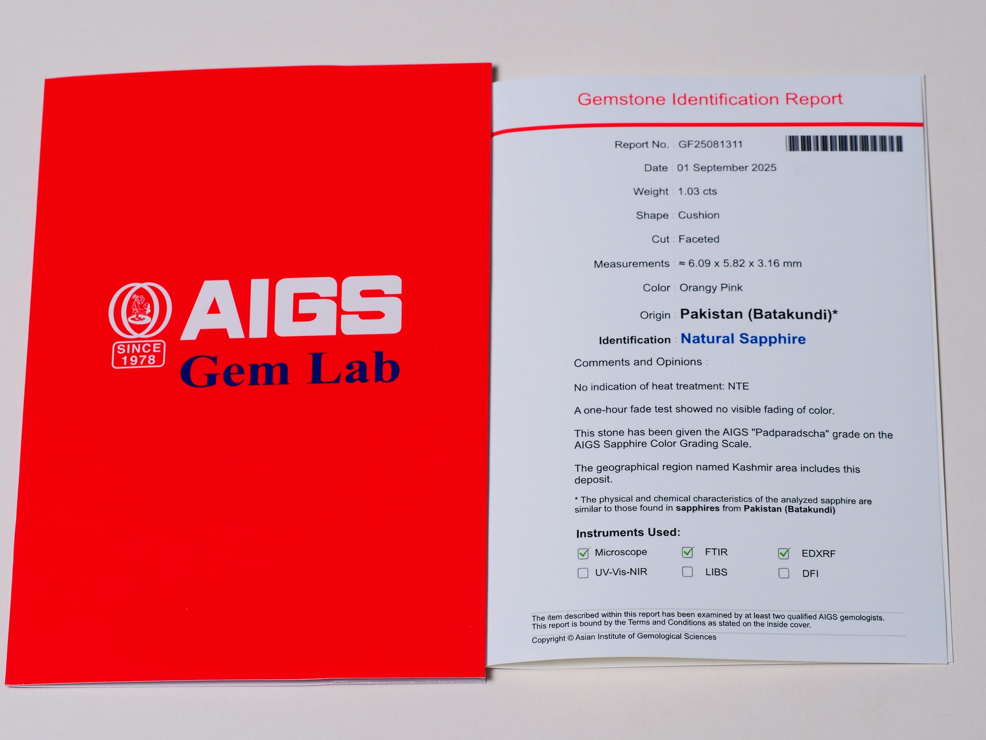 This certified 1.03ct Kashmir Padparadscha sapphire is a rare and exquisite gemstone distinguished by its natural, no-heat treatment provenance. Valued for its unique blend of pinkish-orange hues, this sapphire offers exceptional purity and brilliance, making it ideal for collectors and connoisseurs seeking authenticity and outstanding colour quality in fine jewellery.