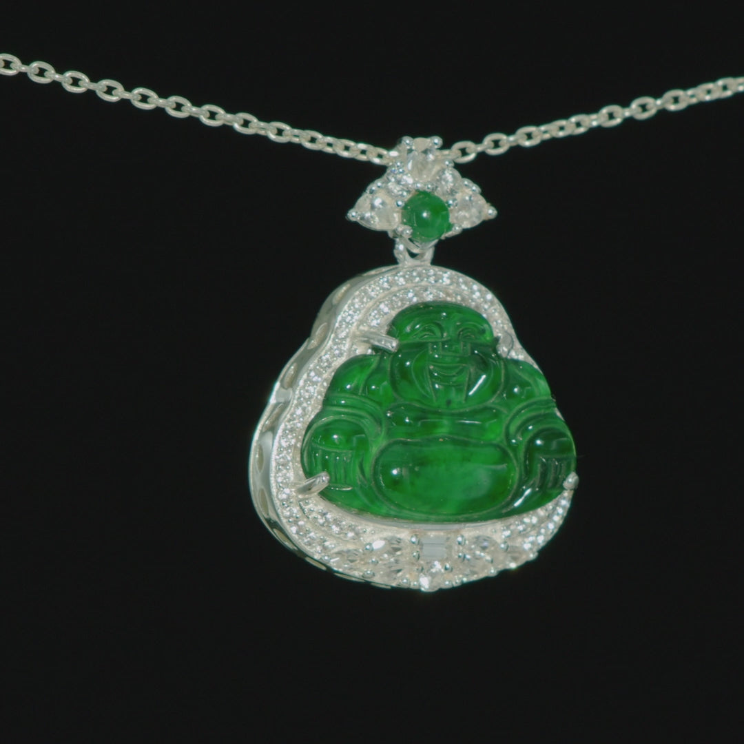 This is a beautiful glowing Imperial green Buddha mounted on silver. Small but well designed affordable piece.